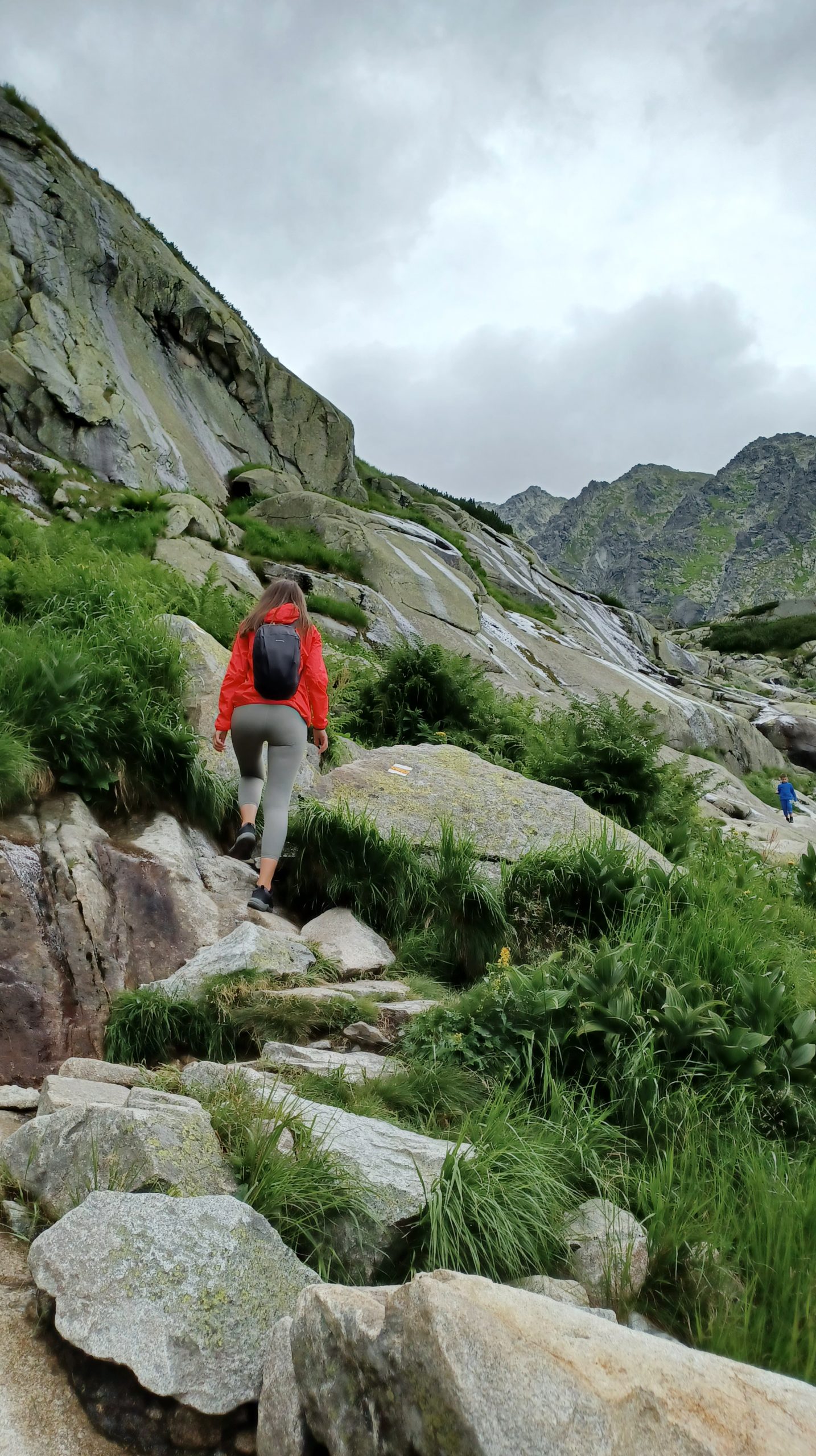 Pôvodne sme sa pri vodopáde chceli otočiť naspäť, ale máme dobrý medzičas a počasie sa aspoň na pohľad zlepšilo, takže pokračujeme po žltej značke ďalej smerom nad vodopád. Úsek okolo vodopádu je zaistený troma reťazami, ktoré je však pomerne jednoduché zvládnuť. Pomaly sa dostávame nad vodopád, kde nás víta Pleso nad Skokom.